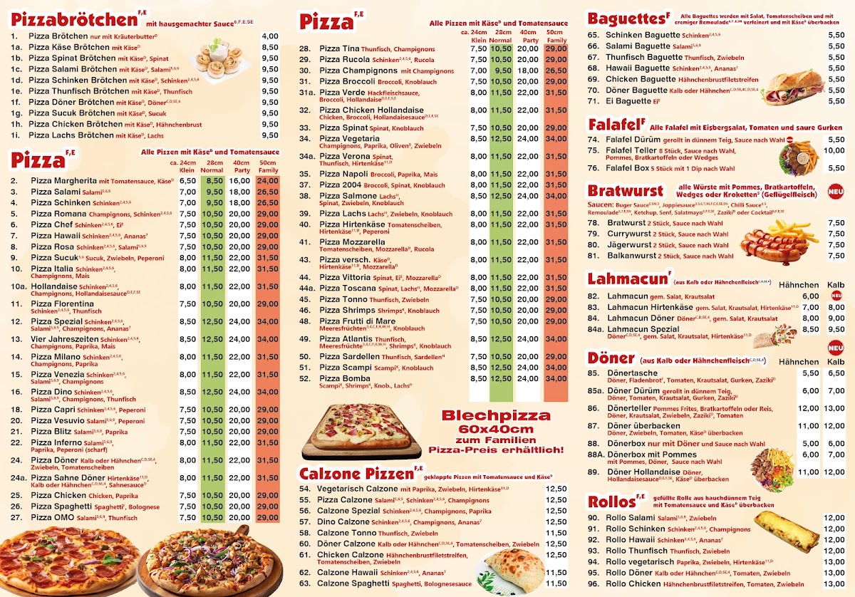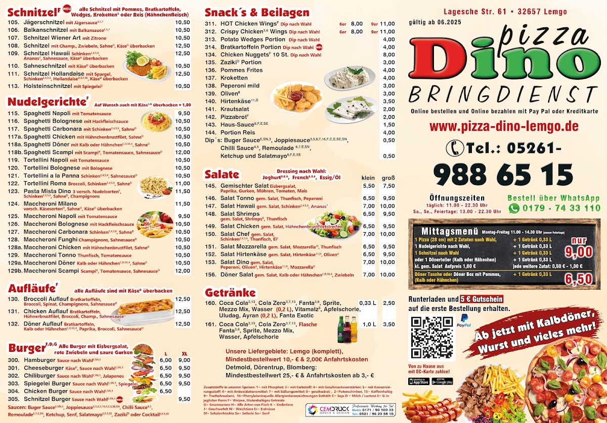Welcome to Pizza Dino Lemgo, your go-to pizza takeaway spot nestled in the heart of Lemgo. Located at Lagesche Str. 61, this eatery offers a vibrant menu designed to satisfy every palate. Start your culinary journey with their classic Pizza Margherita for only €8.50, or indulge in the rich flavors of the Pizza Sucuk, featuring spicy sausage, onions, and peppers for €11.50.